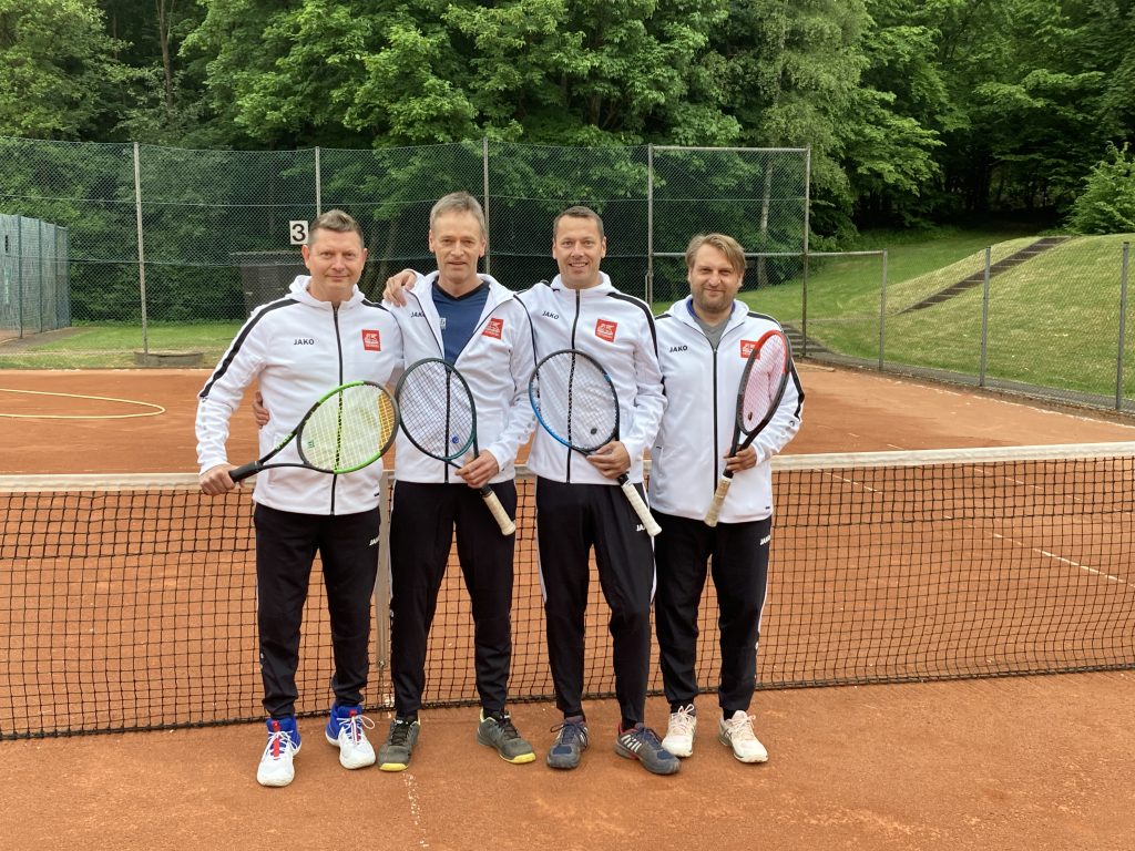 Bild: die Herren 30 holen beim TC Usingen ihren ersten Punkt auf Landesebene (v.l.n.r.: Chris Rozsa, Robert Hohmann, Christoph Messing, Lutz-Philipp Magnus) / Foto: Messing